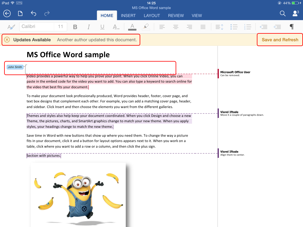 Gigel Popescu (Windows 8.1 + MS Office 2013 user) will receive notifications about the updates and after the user clicks UPDATES AVAILABLE, the changes performed by Viorel Iftode (iOS user) will be visible.
