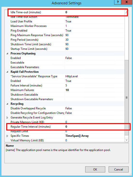 5. Adjust the IIS App Pool Recycling and Process Model settings.