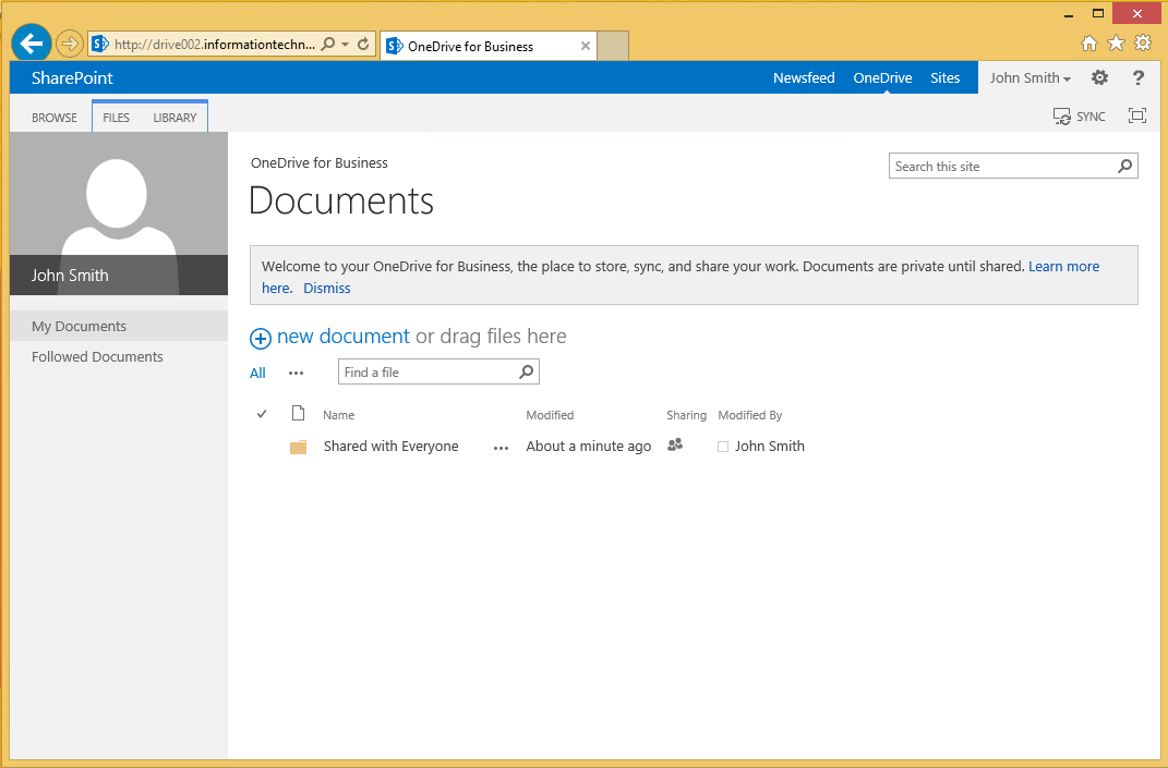 This time the URL of the OneDrive personal site will not contain anymore %20 because the user name doesn’t have any space characters in it. http://drive002.informationtechnology.ro/personal/itech_john_smith/_layouts/15/start.aspx