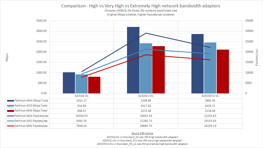 In the above chart, we can see a comparison between Azure Low, Moderate and High network bandwidth adapters. From this chart we can see there is a clear difference in performance between them. Microsoft is not providing exact numbers what low, moderate or high network bandwidth means, but so far from the [4096 B; 0% Read; 0% random] IOmeter benchmark results, we can say: